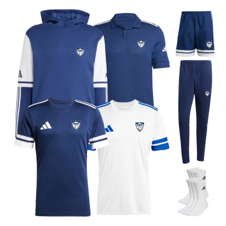 Il comprend tous les essentiels adidas aux couleurs du club : polo, short, jogging, sweat à capuche, maillots (blanc et navy) et chaussettes.