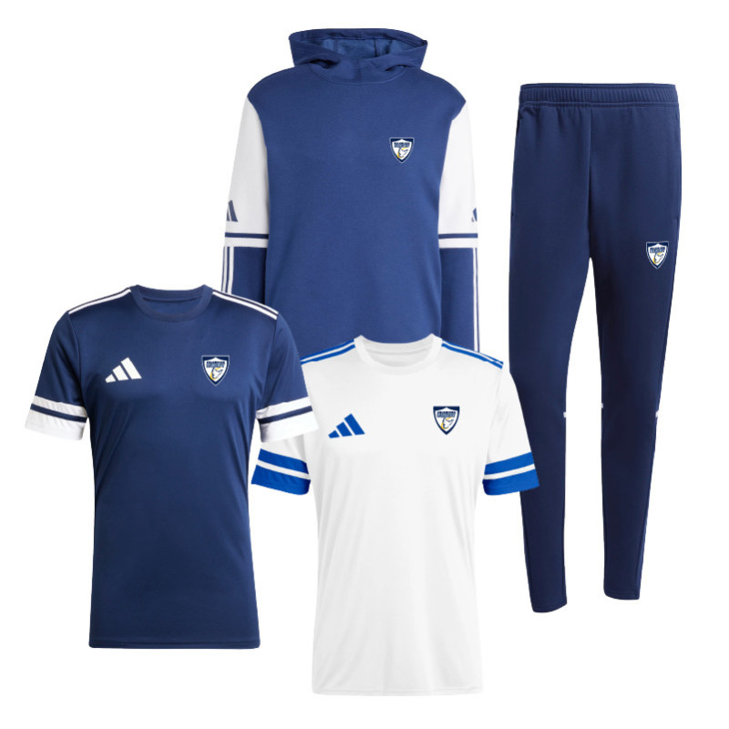 Il comprend un jogging et un sweat à capuche adidas, deux maillots (navy et blanc) ainsi qu’une paire de chaussettes adidas.